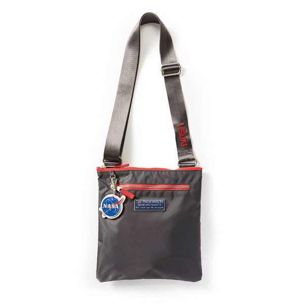 Our grey NASA nylon pouch is a sleek, all-purpose satchel that’s light enough to travel anywhere. The iconic NASA “worm” logo is embroidered on the adjustable strap. It’s perfect to sling over your shoulder or across the body – there’s no wrong way to wear it. This everyday bag carries all your essentials with an additional exterior zip closure pocket, that is the excellent spot to store your phone. Comes with our removable NASA keyring – also available for purchase.