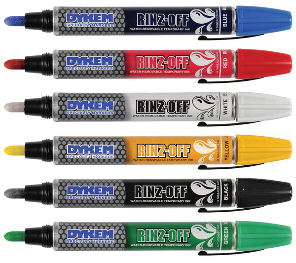 RINZ OFF® 44 are markers perfect for temporary writing on non-treated, non-painted metal surfaces which require ink that can be removed with water. The RINZ OFF® 44 features a screw cap and a threaded end that can be screwed into a jig or apparatus for a continuous identification application.